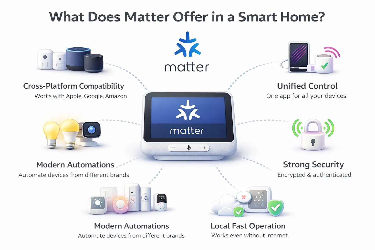 Matter devices communicate locally within the home, without relying on cloud servers for every command.