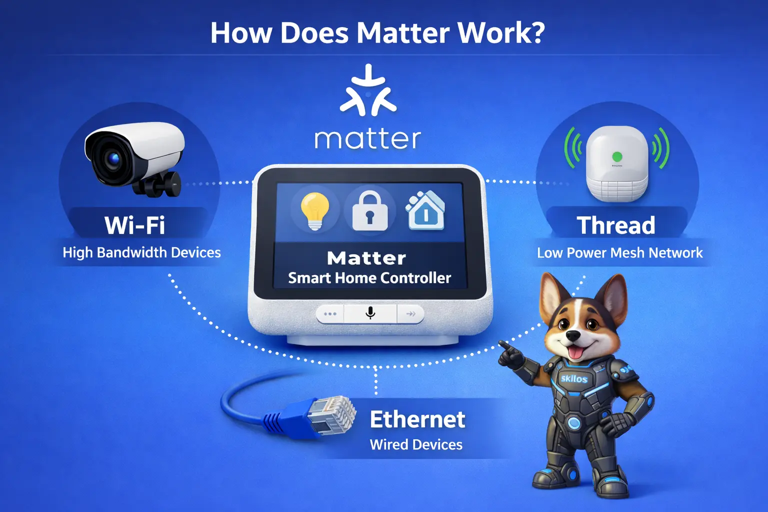 Matter is not just another wireless protocol — it is a communication standard that runs over existing network technologies such as:
